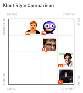 Entre las gráficas que maneja Klout, hay una que me gusta mucho y es un cuadro comparativo basado en 8 criterios: