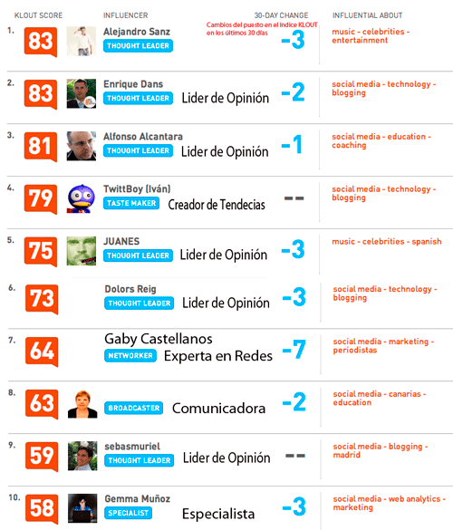 Pueden ver que no siempre el número de seguidores se relaciona directamente con la influencia que tienen las personas según Klout, aunque al final los números siempre mandan, como el caso de Alejandro Sanz.