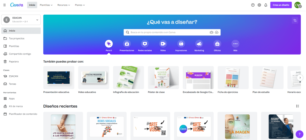Una vez te das de alta en el programa, tienes la oportunidad de crear el diseño que necesites con las dimensiones que necesites. Pero aunque puedes ser totalmente autónomo, lo mejor de CANVA son las ayudas que tienes para diseñar sin tener conocimientos previos. Aquí el truco para mí como siempre, es aprender de los «que saben» y por eso, cuando quiero crear, primero uso plantillas de CANVA y sobre esta plantilla hago pequeños cambios para personalizar mi diseño.
