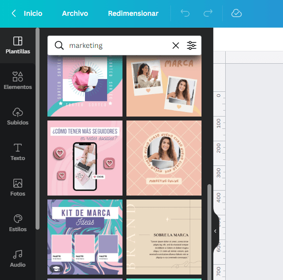 El buscador de CANVA es excelente y te permite, como pueden ver en la imagen inferior, conseguir plantillas relacionadas con la temática que quieran diseñar. Esto ya es una gran ayuda que después con cierto criterio aprendido podrán llevar a cabo y compartir, como yo hago, en sus redes sociales, web o incluso en productos más tradicionales impresos como folletos, trípticos o posters.